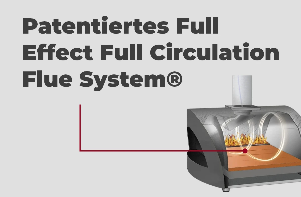Effizienter als klassische Abluftsysteme: Während herkömmliche Pizzaöfen heiße Luft direkt über den Kamin nach oben abführen („up and out“), nutzt Alfa eine patentierte Umluft-Technologie. Das Full Effect Full Circulation Flue System® sorgt dafür, dass die heiße Luft zunächst in der Backkammer zirkuliert, bevor sie nach außen geleitet wird. Dadurch erwärmt sich der Schamottestein zusätzlich, was für eine gleichmäßige Hitzeverteilung und perfekte Backergebnisse sorgt.