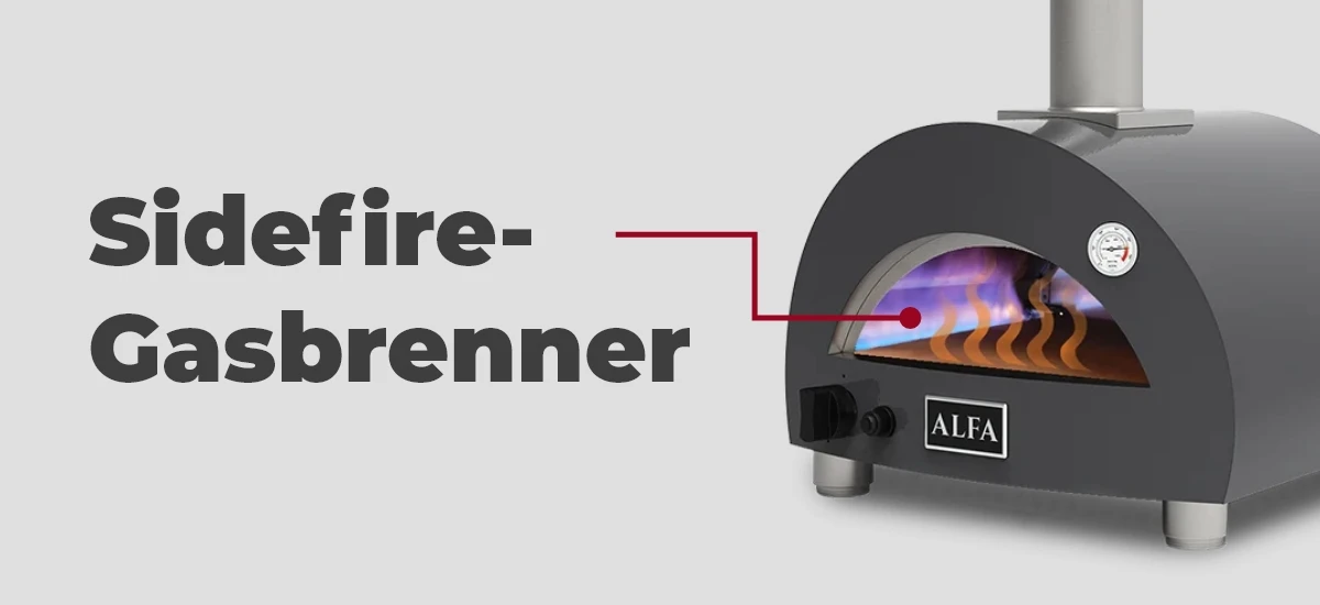 Alle Alfa-Gasbacköfen sind mit dem Sidefire-System ausgestattet. Hierbei befindet sich der Alfa-Brenner seitlich im Ofen, anstatt – wie bei anderen Modellen – am Boden.