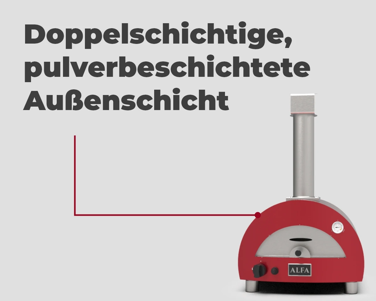 Für maximale Langlebigkeit und Wetterbeständigkeit: Jeder Alfa-Pizzaofen wird in einem aufwendigen Sieben-Schritte-Verfahren mit einer zweischichtigen Pulverbeschichtung versehen. Diese Beschichtung sorgt für eine verbesserte Widerstandsfähigkeit gegen Witterungseinflüsse, eine längere Lebensdauer und eine einfache Wartung.