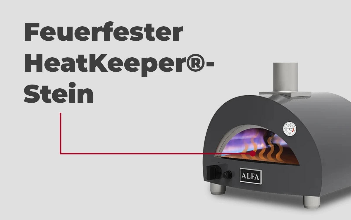 Der in Italien von Alfa gefertigte HeatKeeper™ Schamottestein speichert Wärme effektiver als Lavastein oder Keramik, die in anderen Pizzaöfen zum Einsatz kommen. Diese Eigenschaft ist essenziell für eine optimal gebackene Pizza: knusprig und luftig zugleich – ohne anzubrennen.
