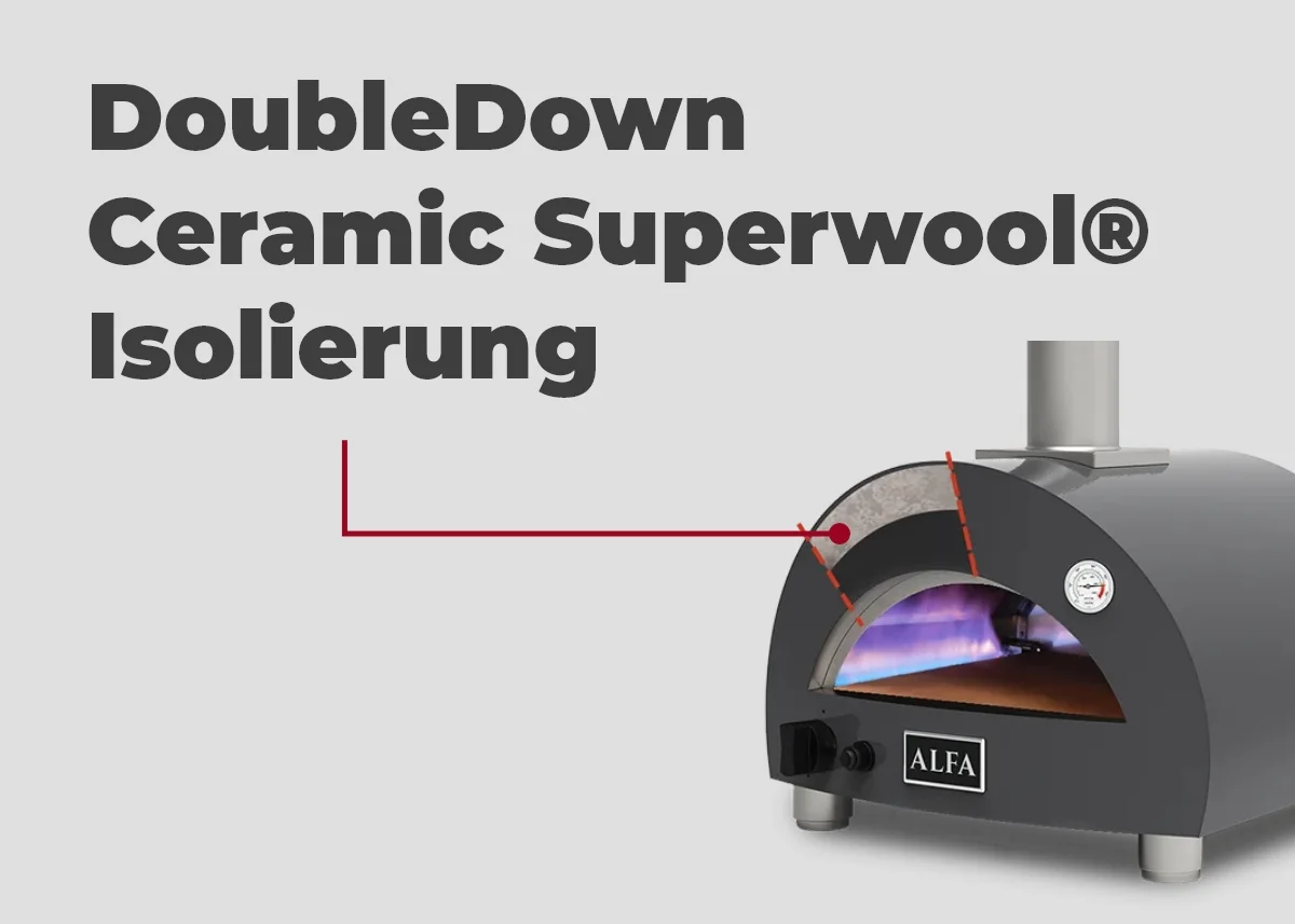 Höhere Wärmespeicherung im Vergleich zu herkömmlicher Steinwolle: Der Hohlraum zwischen den Edelstahlwänden eines Alfa-Pizzaofens ist mit DoubleDown Ceramic Superwool® gefüllt – einer speziellen Keramikfaser, die doppelt so hitzebeständig ist wie übliche Steinwolle, die oft in Haushalts-Pizzaöfen verwendet wird. Diese Isolierung sorgt für eine herausragende Wärmedämmung, verhindert übermäßige Hitzeentwicklung an den Seitenflächen und ermöglicht es, mit nur 0,50 kg Brennstoff pro Stunde konstant perfekte Backergebnisse zu erzielen.