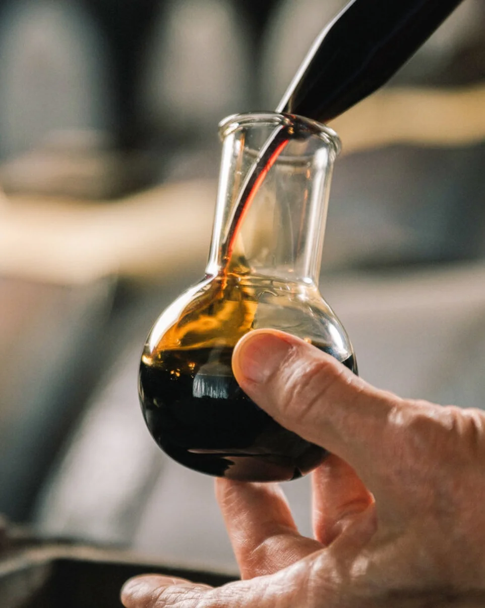 Die Farbe des Balsamico Riccardo Giusti ist ein tiefes, glänzendes Mahagoni. In der Nase entfaltet er ein Bouquet von Aromen, das an reife Früchte, Holznoten und einen Hauch von süßer Melasse erinnert. Am Gaumen zeigt er sich ausgewogen mit einer perfekten Harmonie zwischen süß und sauer. Er lässt Dich Noten von Pflaumenmus, roten Früchten, Honig und Vanille schmecken.