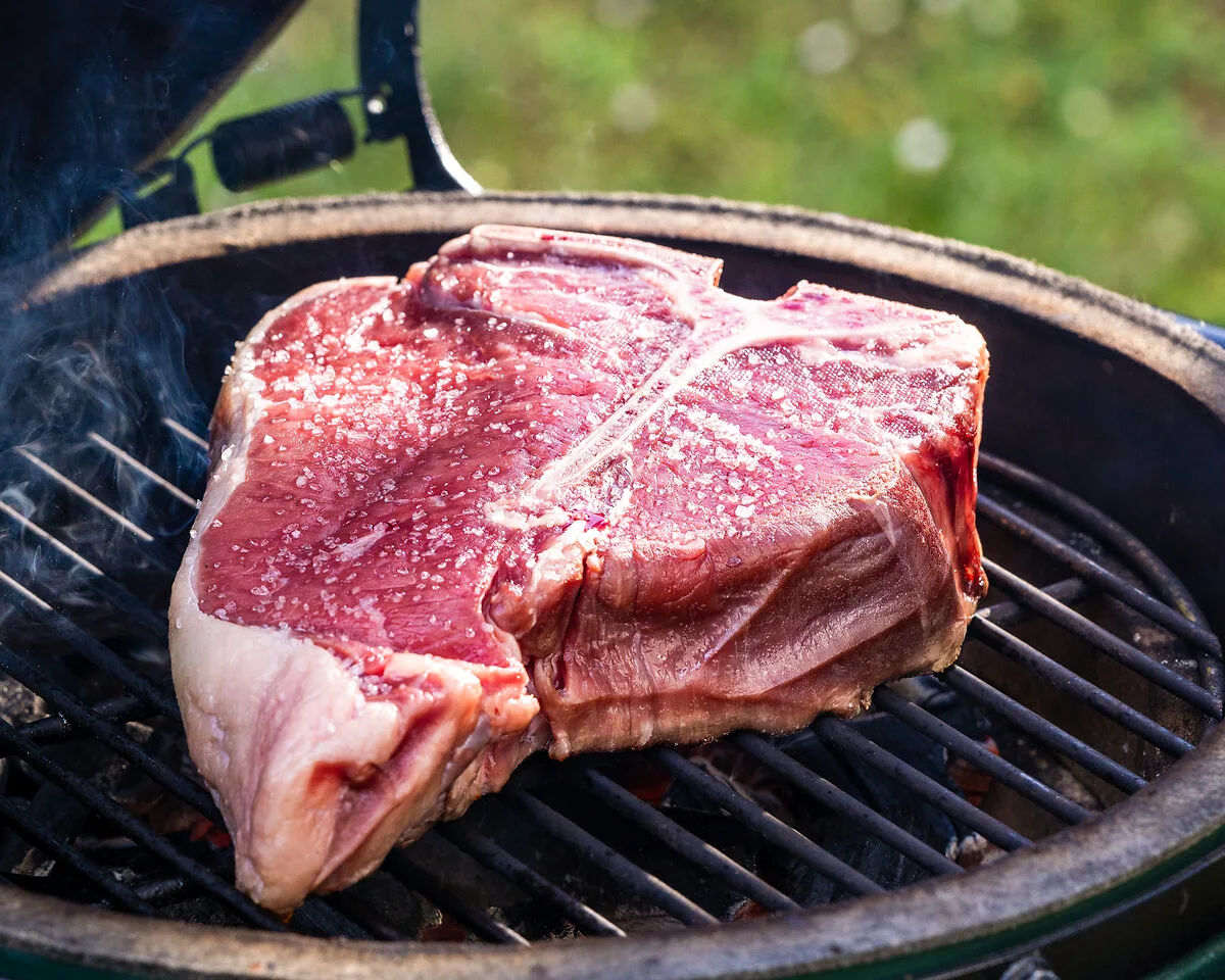 Bistecca Fiorentina ruht auf dem Grill über Holzkohle, bekommt außen eine kräftige Kruste und bleibt innen butterzart – ein archaischer Genuss, der jede Grillrunde krönt. Nur Salz, frisch gemahlener Pfeffer und ein Spritzer Zitrone – mehr braucht es nicht. Grill das Steak „al sangue“ bis es außen knusprig ist und der Kern 50 °C erreicht. Lass es kurz ruhen und schneide es in dicke Tranchen. Dazu: toskanisches Olivenöl, Rosmarin und ein kräftiger Primitivo.