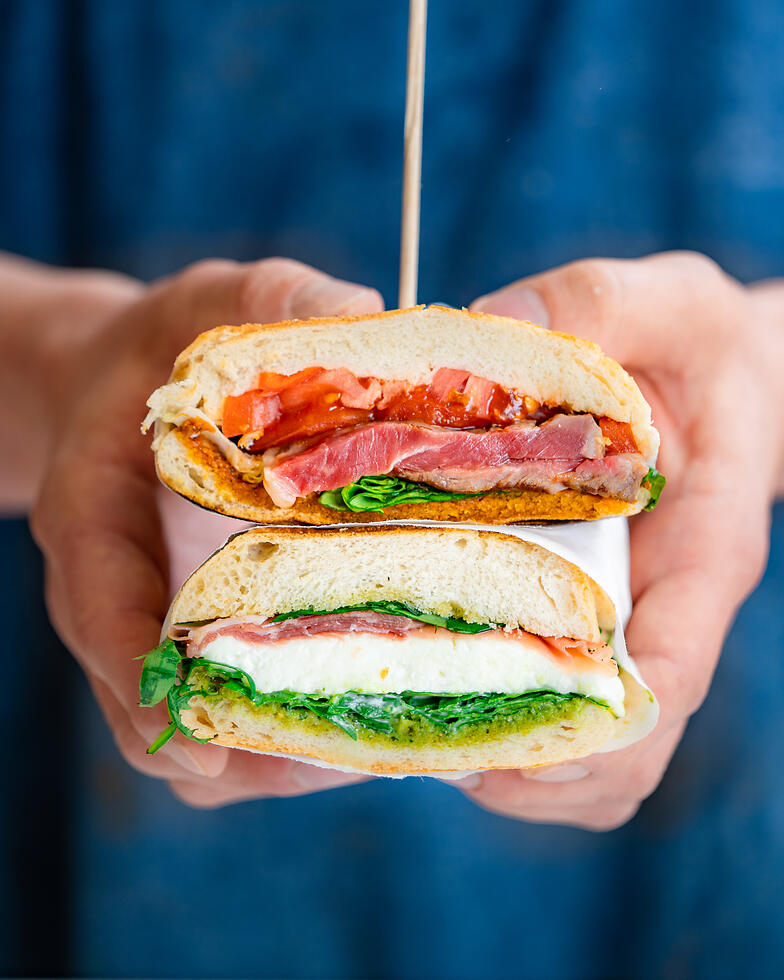 Unser erster Vorschlag ist ein Klassiker, ein Ciabatta belegt mit Salami, Schinken, Mozarella und Rucola. Die zweite Variante ist eine italienische Interpretation eines Steak Sandwich, belegt mit Tranchen von kurzgebratenem Bistecca und Tomaten. Am Ende des Artikels finden Sie ein Sandwich aus der Pfanne, mit cremig geschmolzenem Taleggio-Käse.