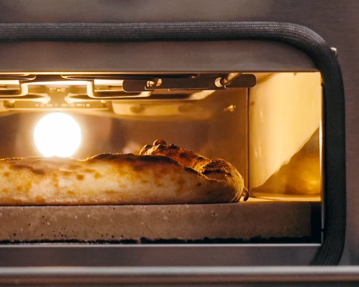 Die Backfläche ist mit 35×40 cm großzügig, die Kammerhöhe von 9 cm lässt genug Raum zum Arbeiten mit der Pizzaschaufel. Der Ofen backt die Pizza aber so gleichmäßig, dass es nicht nötig ist, die Pizza zu drehen.