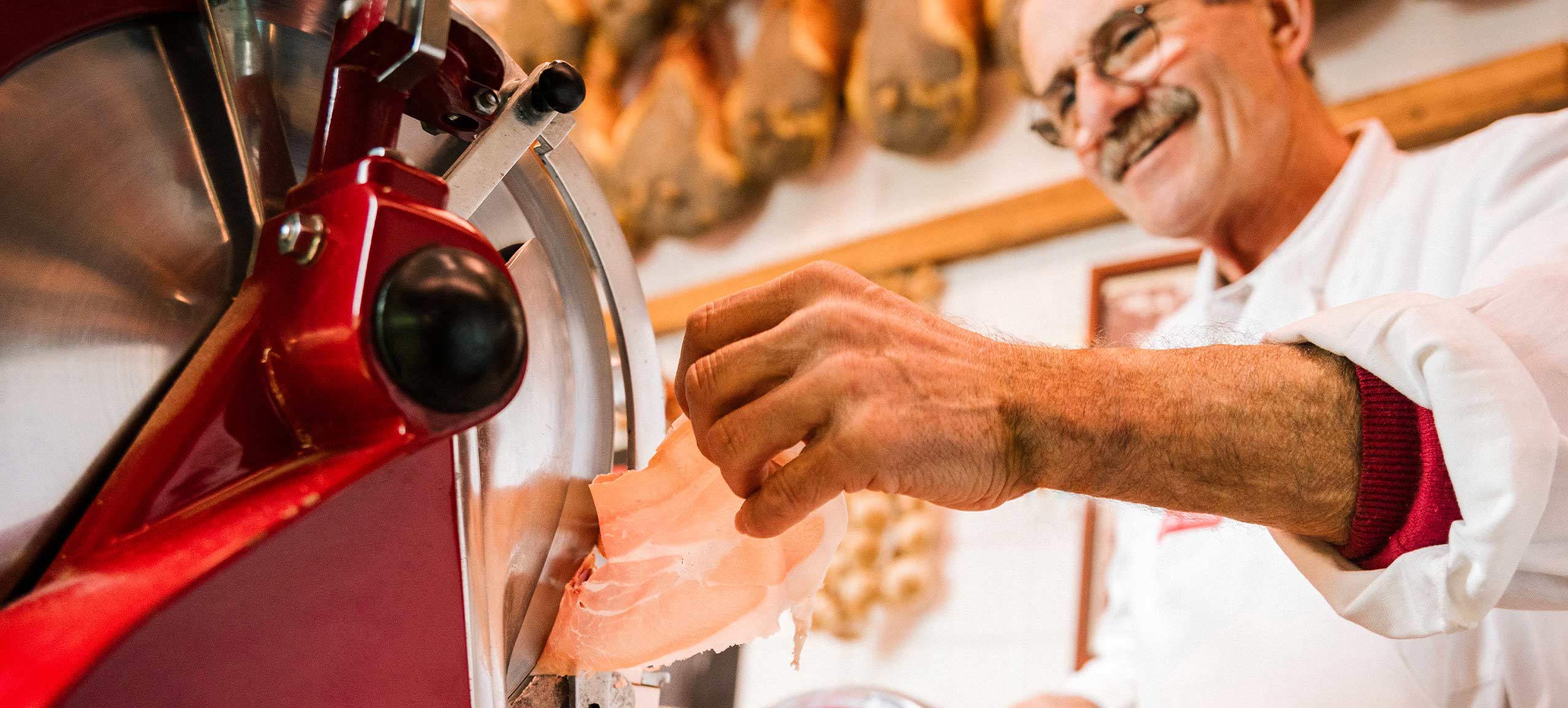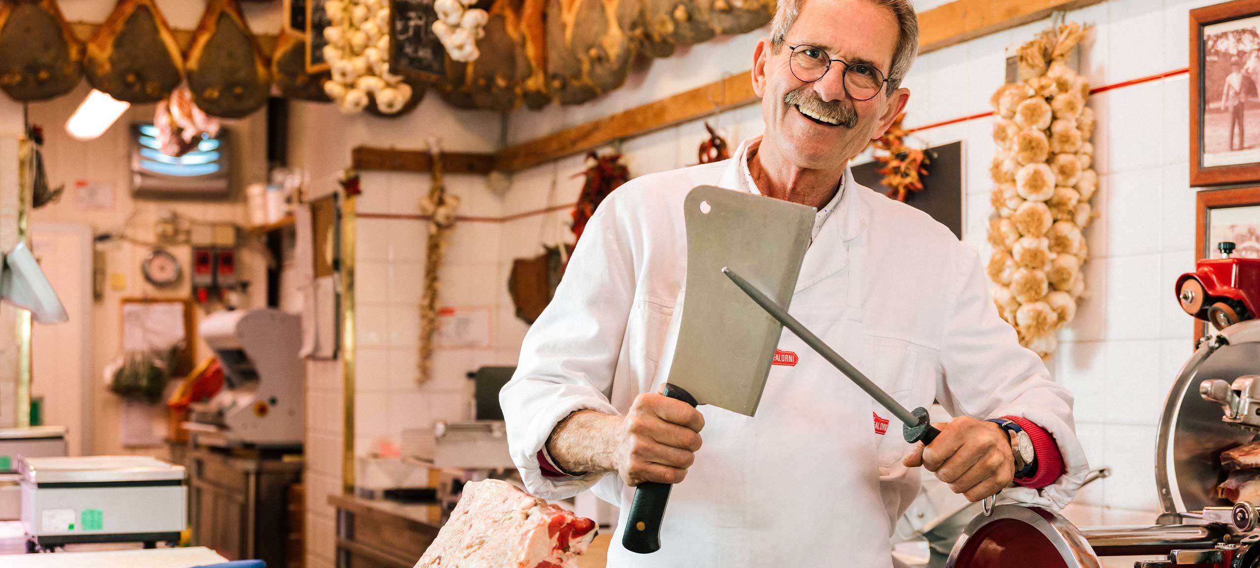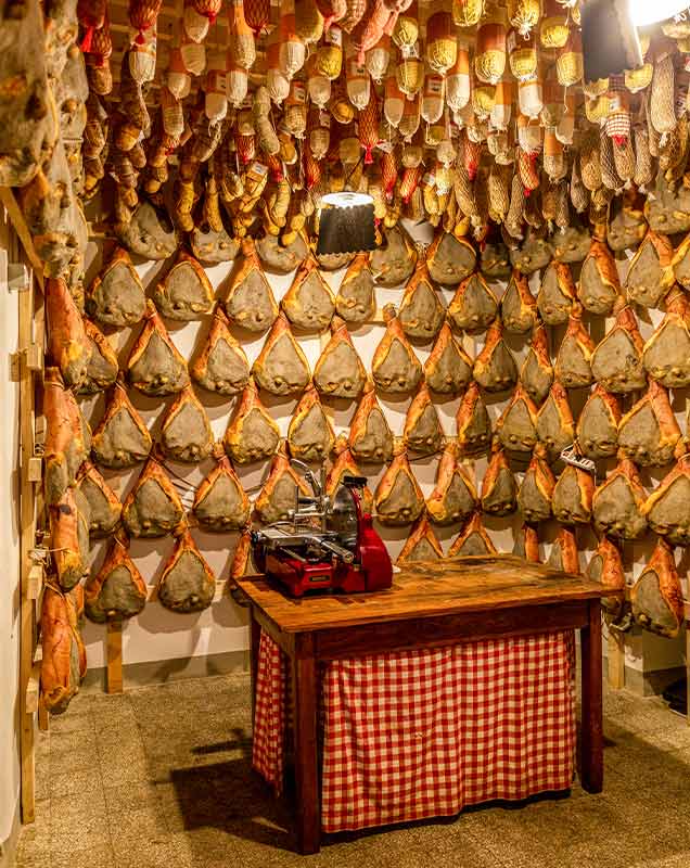 Die Fassade des Geschäfts erzählt die Geschichten des kulturellen Erbes, das diesen Ort umgibt. Das traditionsreiche Logo, das bis heute unverändert geblieben ist, thront stolz über den Arkaden. Beim Betreten der Macelleria umfängt einen sofort würziger Duft. An der Decke baumeln Reihen von delikaten Schinken, während sich in den Körben köstliche Würste wie vor einem Jahrhundert türmen.