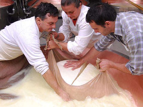 Mit der Käseharfe wird nun der Bruch erzeugt und das Granulat setzt sich langsam am Kesselboden ab. Eine Stunde vergeht, dann hebt Paolo einen riesigen Käseballen aus dem Kessel. „Das ist der schönste Moment: die Geburt der Zwillinge!“, sagt Paolo und teilt mit einem langen Messer den Käse. Später gehen die Laibe in einer Salzlösung baden. 18 Tage braucht das Salz bis es das Herz des Käses erreicht und ihm seine einzigartige Würze verleiht.