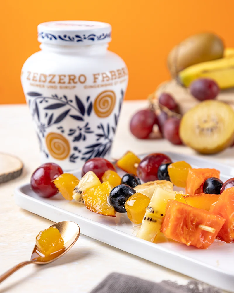- kandierte Ingwerstückchen in Kurkuma-Sirup
