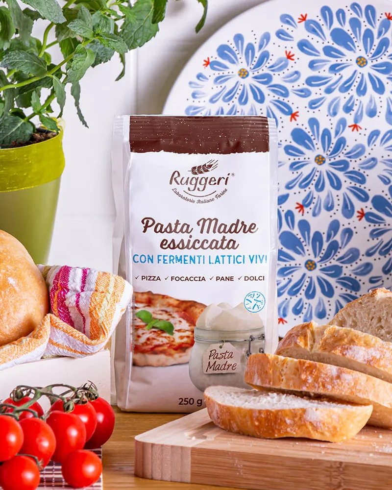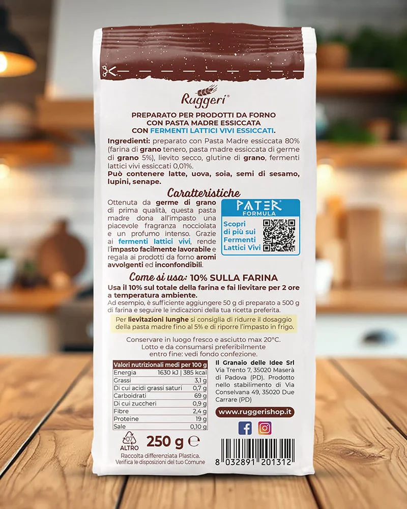Die Mischung besteht aus Weichweizenmehl des Typs 0, Weizenkeimmehl und Sauerteig-Pulver. Egal ob Weichweizen, Hartweizen, Dinkel oder Kamut: Die Lievito Madre kann allen Mehlsorten zugesetzt werden. Sie ist ideal zum Backen von Brot, Pizza, Focaccia, Grissini und Crackern.