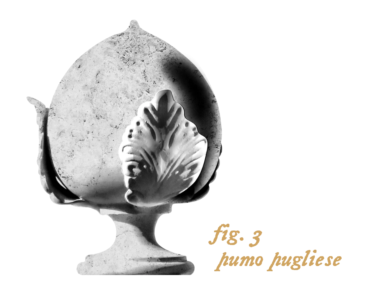 Im Weinland Apulien symbolisieren Pumi Fruchtbarkeit und Wohlstand. Pumi waren einst dem Kult der römischen Göttin Pomona gewidmet und prägen die Architektur der weiß getünchten Städte Apuliens bis heute. Man findet sie an den gusseisernen Balkonen, an Säulen, Toren oder als kleine Glücksbringer in den Wohnungen der Menschen.