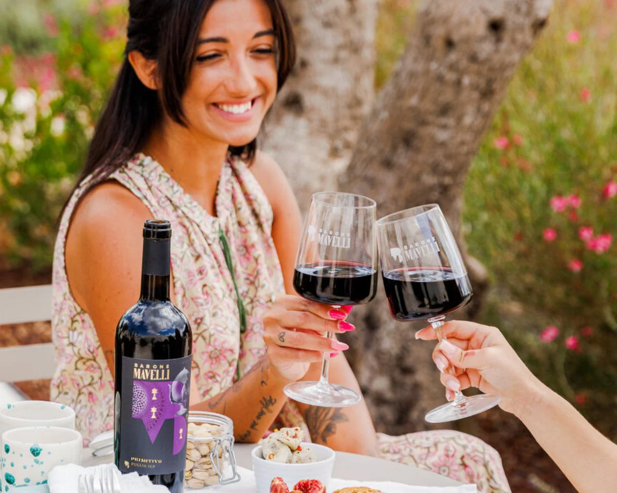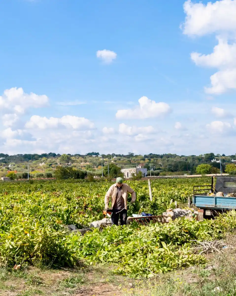 Hier tragen uralte Weinstöcke auf sanft geschwungenen Hügeln die kostbaren Trauben. Sie gedeihen auf steinigen Böden, die dem Primitivo seinen mineralischen Charakter verleihen. Verwöhnt von der vollen mediterranen Sonne, reifen die Weinbeeren zwischen Mandel- und Kirschbäumchen heran. Der Wind des Meeres streift mit seiner salzigen Prise hin und wieder ihr Blattwerk.