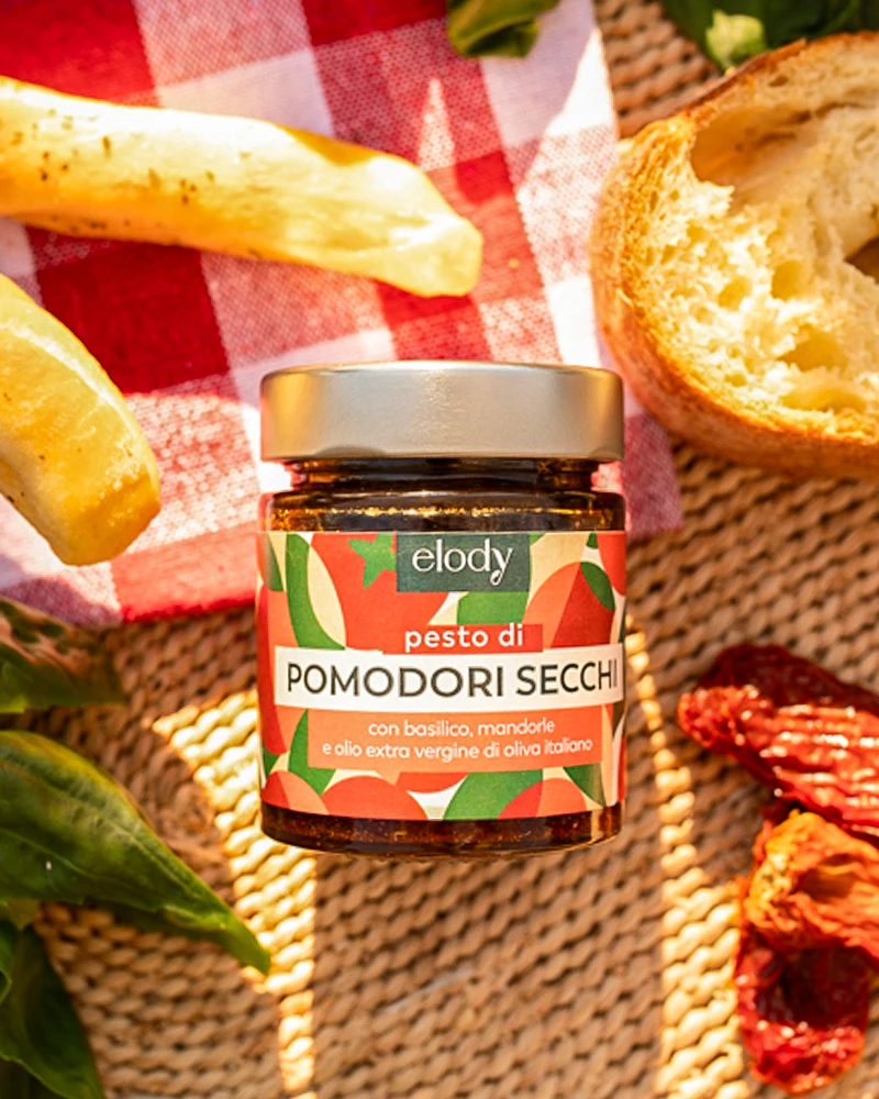 Natives Olivenöl Extra 51%, getrocknete italienische Tomaten 25%, Basilikumkonzentrat (Basilikum 90%, Salz, Natives Olivenöl Extra, Zitronensaft), Mandeln 8%, gefriergetrockneter Käse (Parmigiano Reggiano DOP 98%, Hartkäse 2%), Meersalz, Zitronensaft.