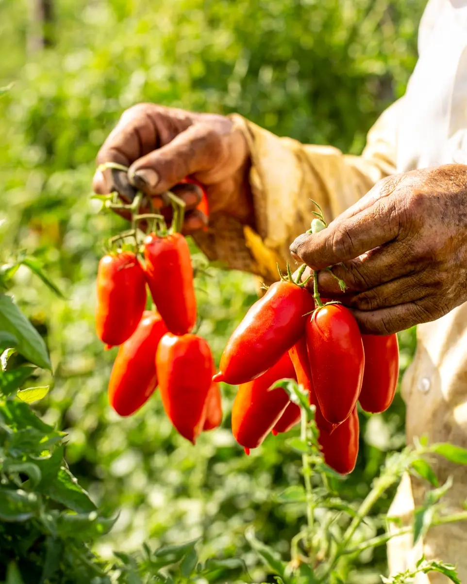 Die Früchte der Sorte San Marzano werden von Hand geerntet wenn sie perfekt gereift sind. So bringen San Marzano Tomaten einen einzigartig süßlich-fruchtigen, ursprünglichen Tomatengeschmack in Ihre Küche.